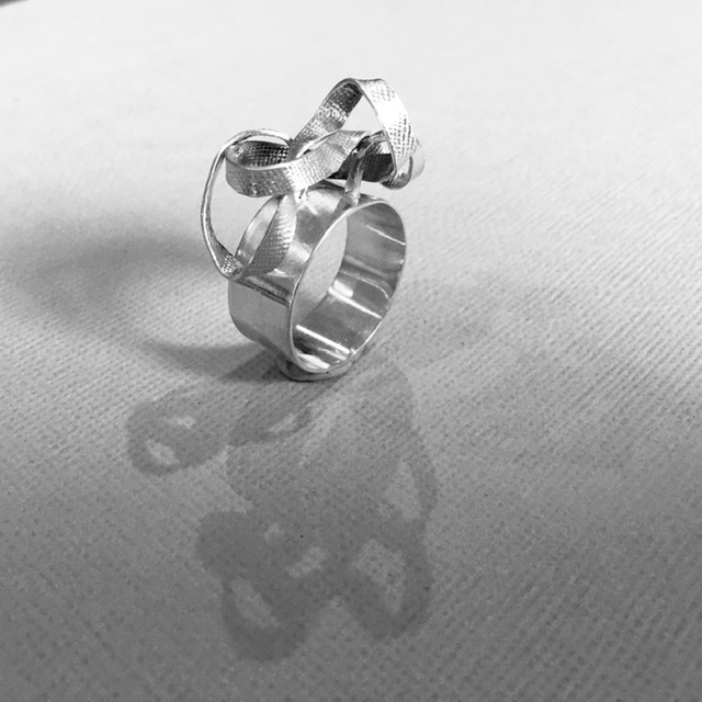 This free flowing ring is made from sterling silver and features a free flowing, scribbly ribbon like design.